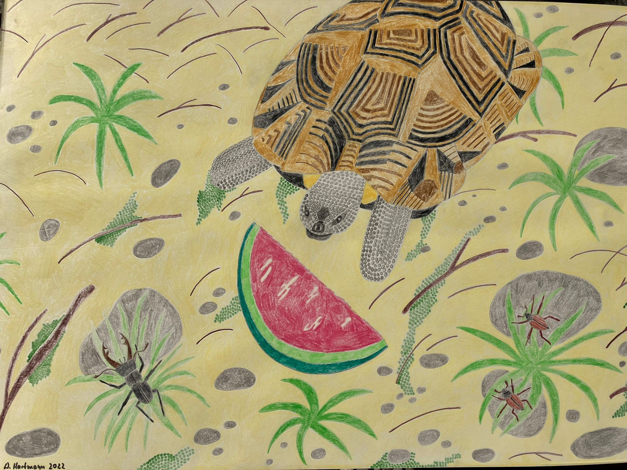 Schildkröte Horus mit Wassermelone,Hirschkäfer und zwei Maikäfern 50x70cm 2022 -